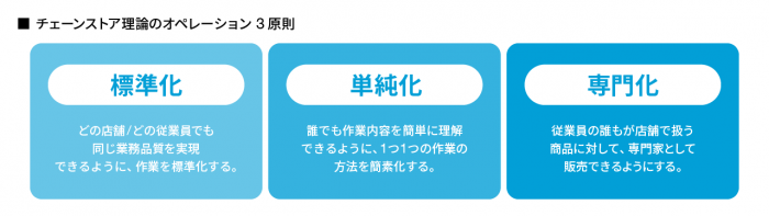 アメリカで生まれた小売業の経営手法であるチェーンストア理論には、店舗オペレーションの3原則が定められています。日本の流通小売業でも、この3原則をもとに店舗オペレーションを定め、従業員への教育を行っている企業も多いのではないでしょうか。