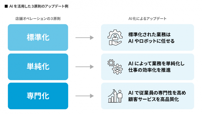 この3原則をもとに定めた店舗オペレーションや社員教育の方法も、AI化にともなって更新が必要になってくるはずです。AIをどう店舗業務に組み込むのかを考え、業務オペレーションを再設定する必要もあるのです。