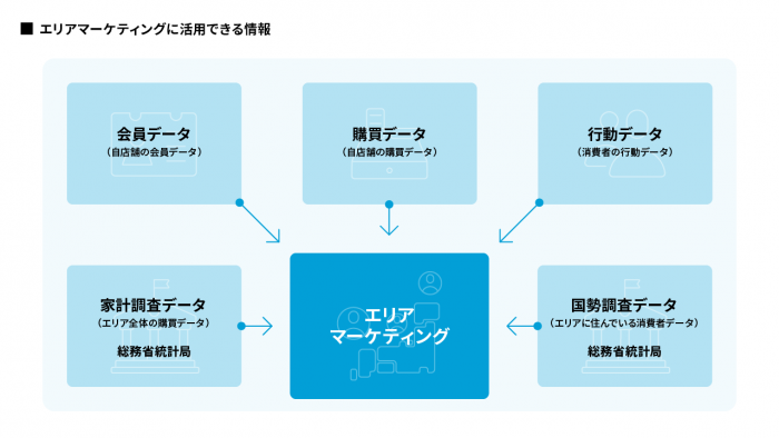 流通小売業におけるエリアマーケティングで用いるのは、店舗の会員情報・購買情報や地域の人口・世帯情報、競合となる近隣店舗の情報などです。主に政府が公開している統計データ、顧客管理システムから取得したお客様データ、GIS(地理情報システム)の地図情報などを取得し、商圏分析やマーケティング戦略の立案を行います。