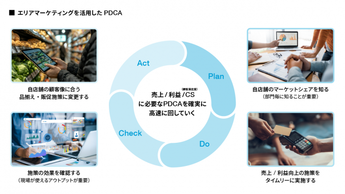 上記のような情報を活用したエリアマーケティングによってPDCAを回せるようになり、お客様のニーズに応える地域一番店を目指していくことができます。