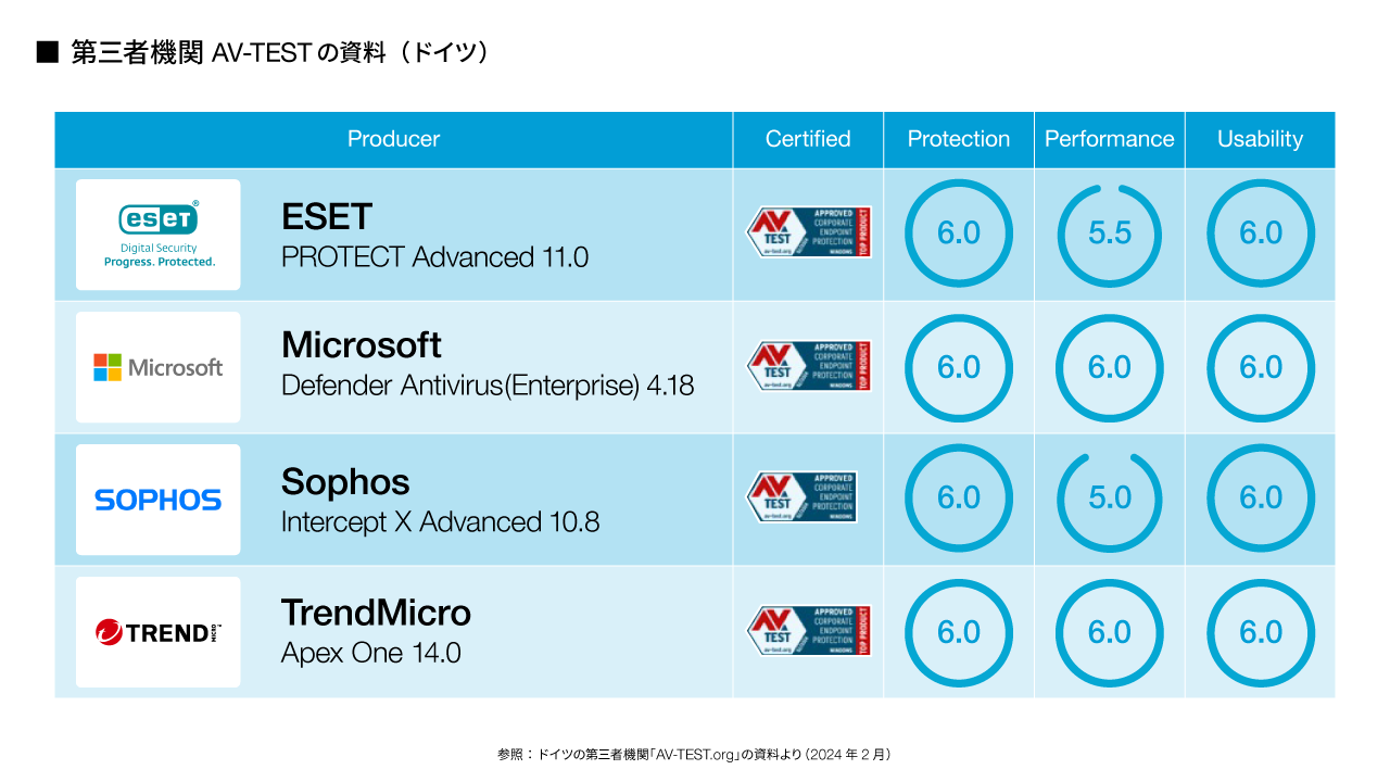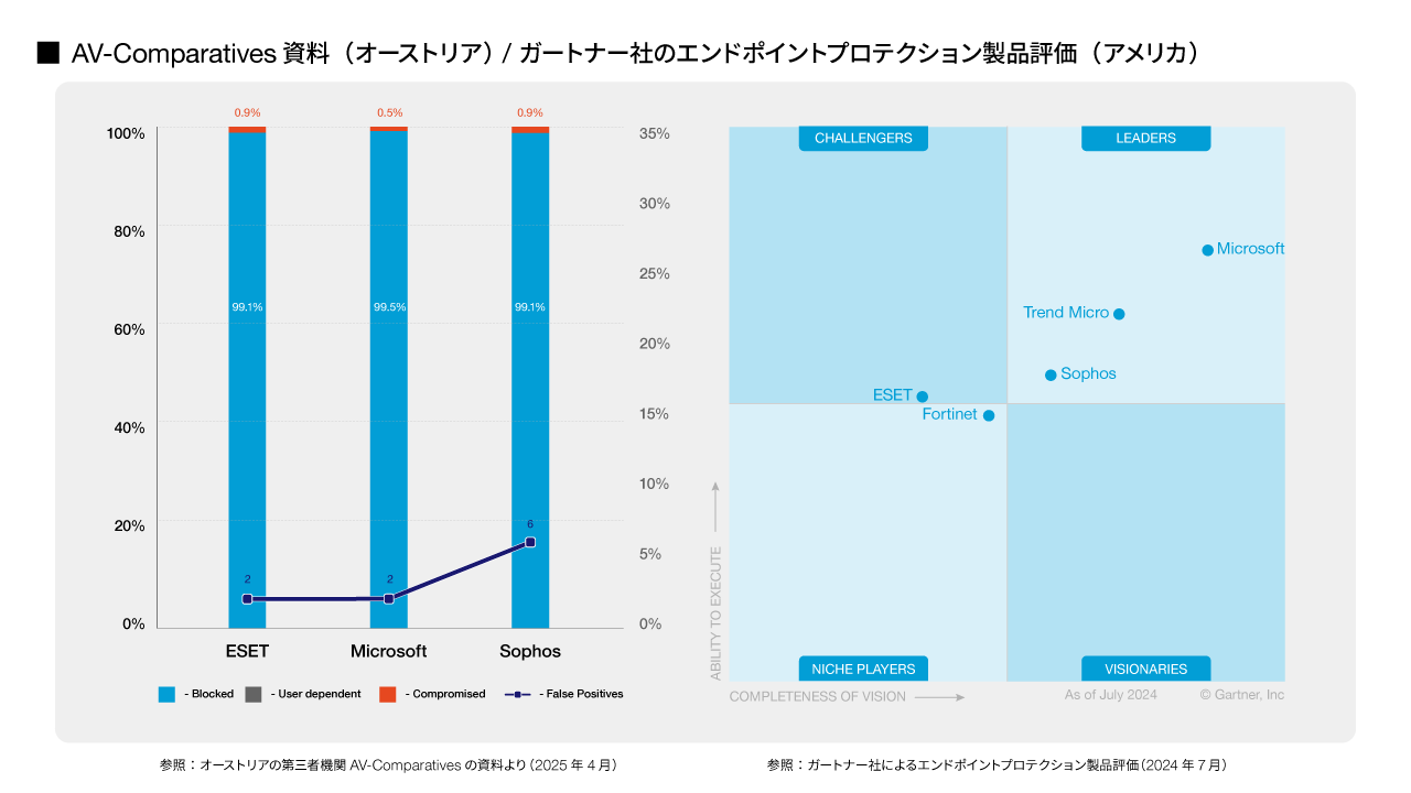 比較の結果、Microsoft Defenderは単なる“無料の付属サービス”ではなく、エンタープライズ環境にも十分対応できる高性能なセキュリティ性能を保持していることが確認されました。ドイツの第三者機関AV-TESTやオーストリアのAV-Comparativesからも高い評価を獲得し、アメリカのガートナー社※によるエンドポイントプロテクションの評価でも上位に位置づけられています。