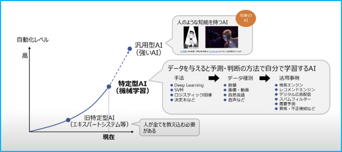 AIはまだ発展途上にあり(図1)、いずれはSF映画に出てくる知能や知性を持った「汎用型AI」へと進化していくと見込まれていますが、現時点で実用化されているのは「特化型AI」あるいは「特定型AI」と呼ばれる単一の機能に特化したAIです。