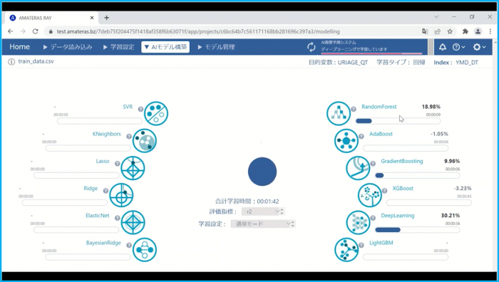 まず、過去のデータなどの学習に必要な情報をインプットデータとして取り込み、AIで予測したい項目をブラウザでクリックし選択すると特徴量が自動で選択され、最大12のアルゴリズムでのチューニングがすべて完了します。(図4)