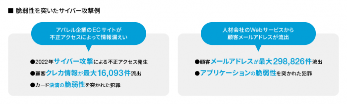 例えば、脆弱性を突かれたサイバー攻撃の事例としては、以下のようなものがあります。