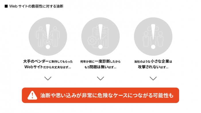 「まさかうちのWebサイトには脆弱性はないだろう」と油断していると、自社のWebサイトのリスクが高まっていることが多々あります。