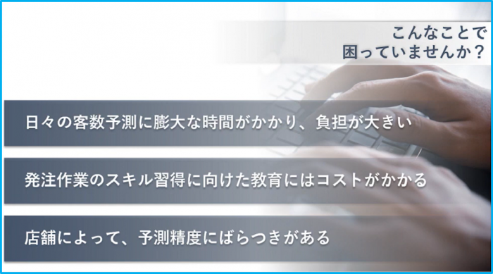 A社様は、店舗(店長)ごとの予測精度のバラつきや、商品の発注数量の確定に時間が掛かっていたなどの課題を抱えておられました。