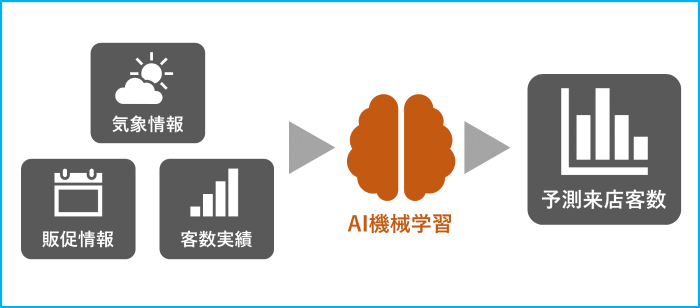 名前の通り機械学習(AI)技術を活用しているのが特徴で、客数、気象情報、販促情報などで構成される過去の実績データを与えることで、見込まれる客数の推定値をAIが算出するサービスです。膨大なデータの中から店舗ごとの傾向(機械学習で言う特徴量)を自動的に抽出しますので、人間では判断が難しいようなデータであっても高精度な予測が可能です。(図2)
