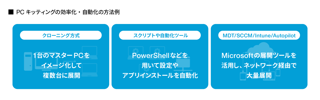 PCキッティングは、かつては1台ずつ手作業で行うのが一般的でした。しかし、手作業では設定漏れや誤設定のリスクが高まるため、現在では効率化や自動化を可能にするさまざまな手法が普及しています。