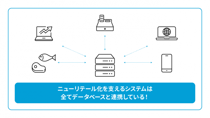 流通小売業の多くの業務ではデータのやり取りが発生しており、システム間のスムーズな連携が要求されます。多くのデータを扱うにはデータベースが不可欠であり、業務処理はデータベースを経由して応答することがほとんどです。