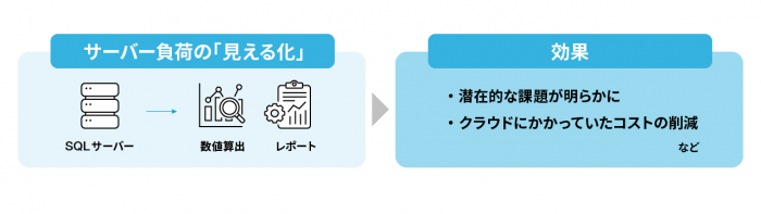 サーバー負荷の「見える化」では、正常値から乖離した異常時の状態も数値化し、今後のリソース状況の予測を算出。データベースサーバーの“健康診断”を実施することで潜在的なトラブルの芽も発見し、最適なスペック選定やキャパシティプランニングをご提案します。