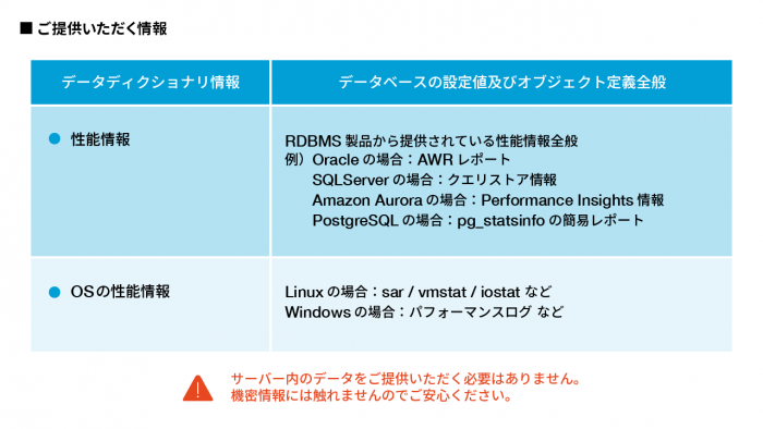 診断時はデータベースの定義体や性能情報が対象となるため、お客様の実データをご提供いただく必要はありません。安心してデータベース改善ソリューションをご利用いただけます。