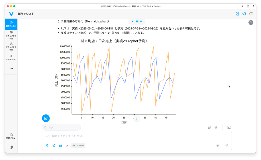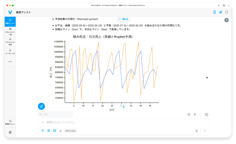 MCPサーバー機能により、チャットインターフェースから売上データの取得、売上予測、グラフ表示まで、自然な会話で実現。バイヤーの商談中でも必要な数字を瞬時に確認できます。