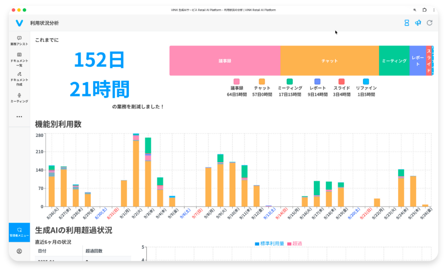 AI利用状況を詳細に分析し、機能別の使用頻度や効果を可視化。業務時間の削減効果を定量的に把握し、投資対効果の最大化をサポートします。
